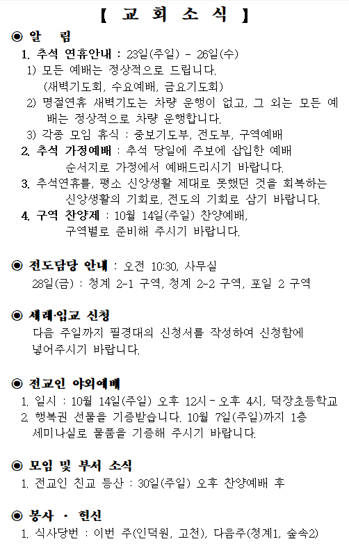 9월 30일 예배순서 및 교회소식