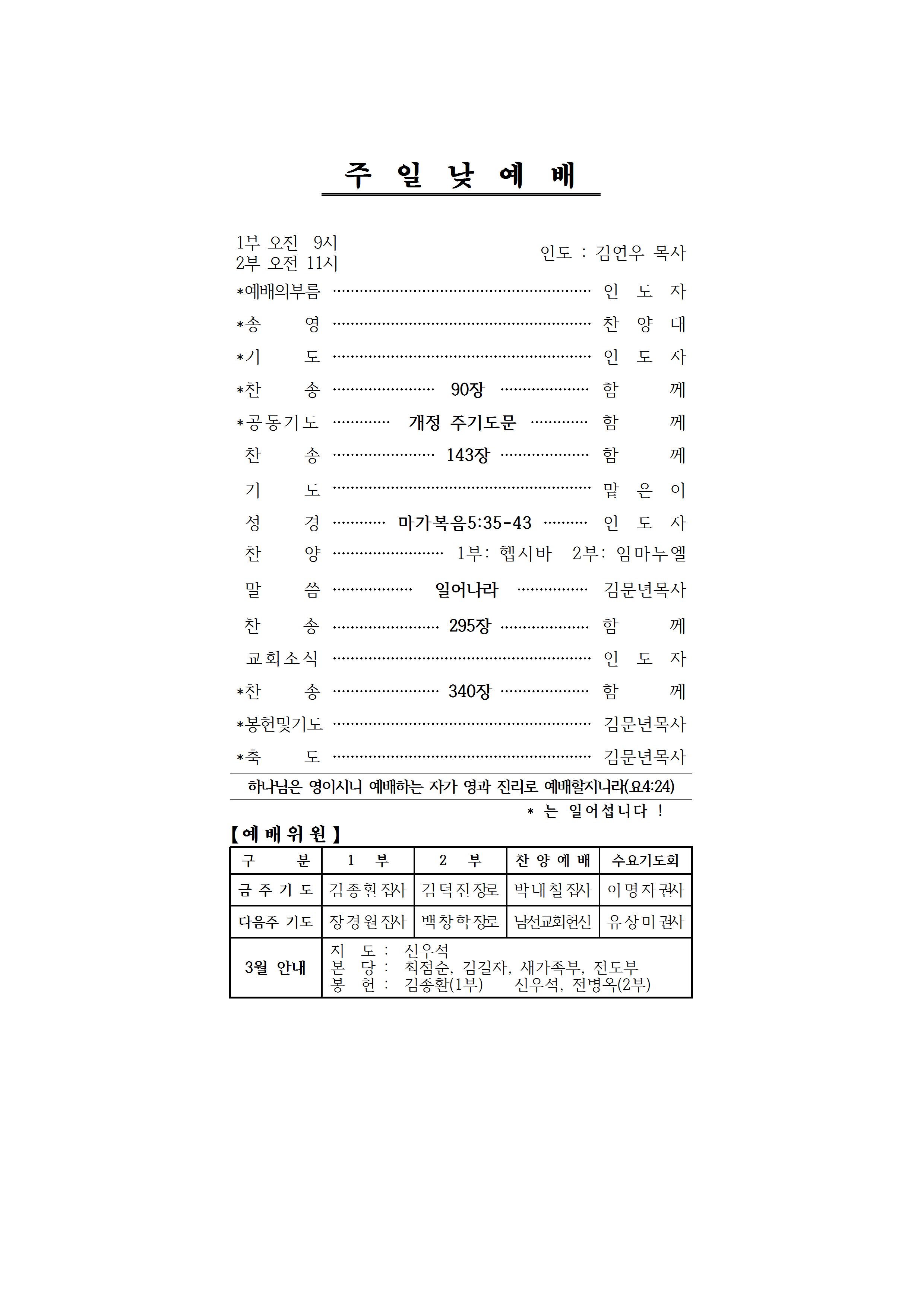 3월 24일 예배및 교회소식